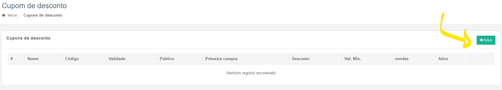 Primeiramente, para acessar a aba de "Cupons de desconto" acesse Loja > Cupons de desconto. Veja na imagem a seguir: