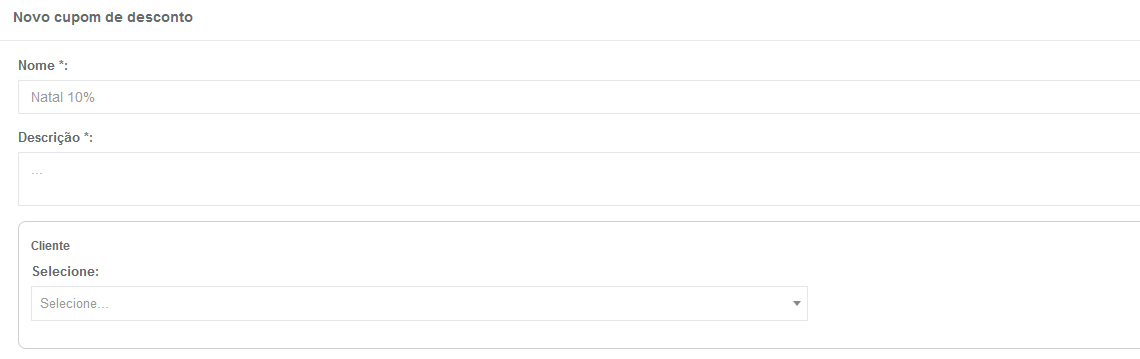 Após acessar a aba de criação do cupom, deverá selecionar um nome e descrição obrigatórios para seu cupom de desconto. Os campos que possuem asterisco ao lado são obrigatórios! Na imagem a seguir podemos ver também o campo "Cliente", se não for selecionado nenhum cliente o cupom valerá para todos, caso contrário tem a opção de habilitar para um cliente em específico.