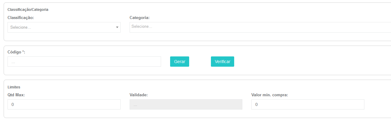 - Código: aqui você tem a opção de gerar um código para seu cupom ou criar seu próprio código exemplo: Cupom Natal, que posteriormente poderá ser utilizado pelos clientes para encontrar e aplicar o cupom. Após gerar o código, lembre-se de clicar em "Verificar"!