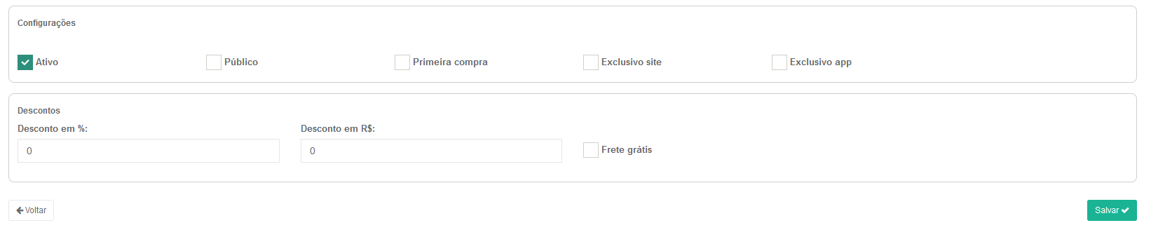 - Configurações: aqui você deverá manter a caixa "Ativo" selecionada e terá as opções de tornar o cupom público, para que ele apareça na aba "Cupons" ou privado que só poderá ser acessado por seu código, primeira compra para apenas os clientes que irão efetuar a primeira compra, exclusivo do site ou exclusivo do app.