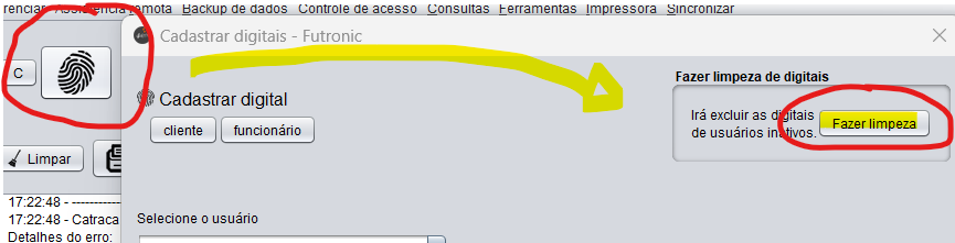 Para fazer a limpeza das digitais, acesse o Ícone que simboliza uma digital e clique em "Fazer limpeza":
