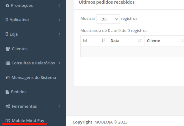1 - No painel de gerenciamento do e-commerce, acesse o menu Mobile Mind Pay: