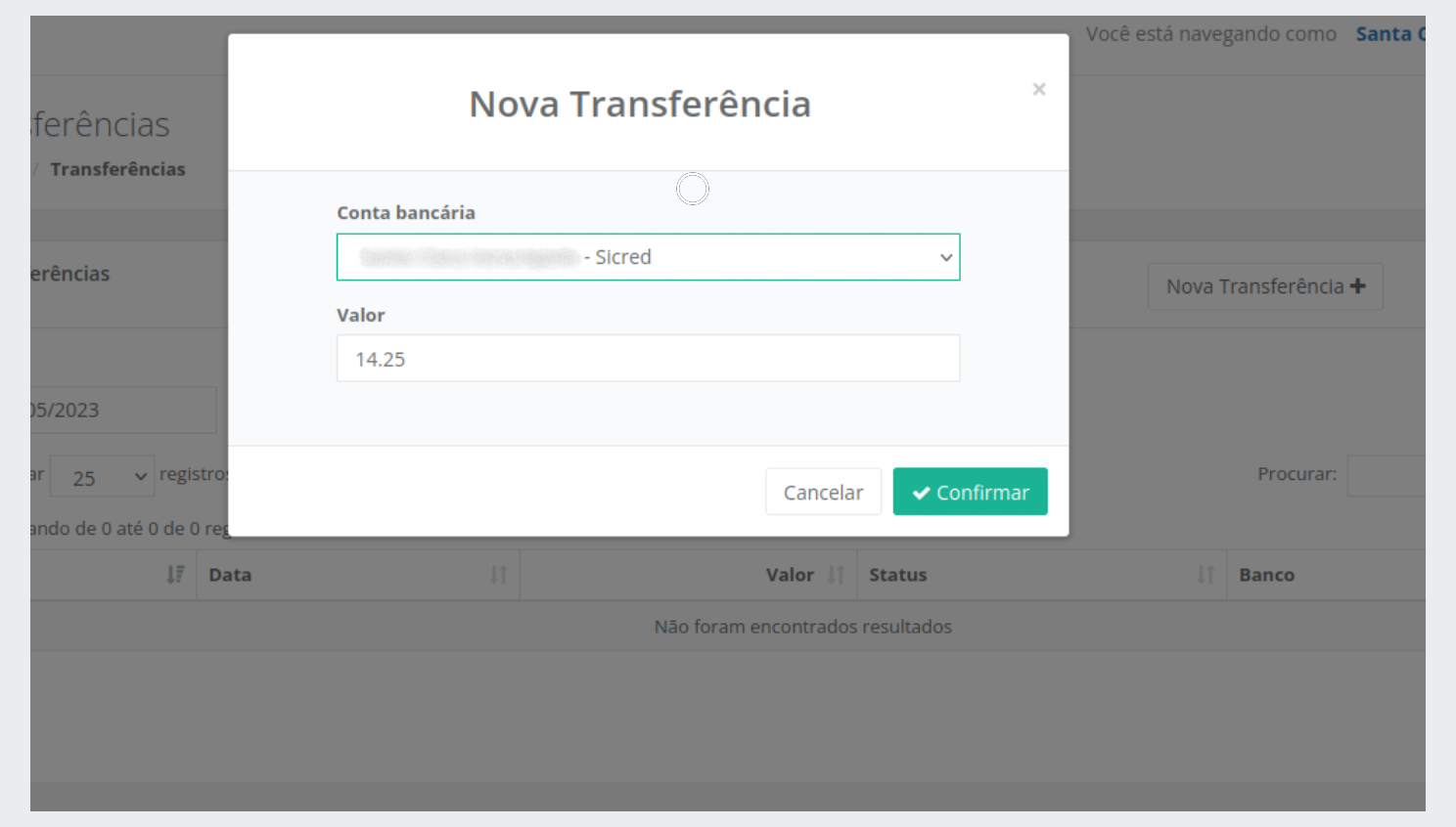 5 - Informe o valor a ser transferido e confirme. O valor não pode ultrapassar o saldo disponível na conta.