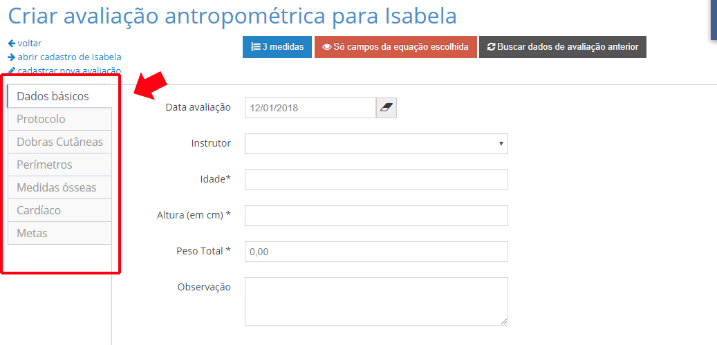 Passo 3Na nova tela que abrir, clique em CADASTRAR AVALIAÇÃO ANTROPOMÉTRICA PARA...:Passo 4Abrirá uma tela com campos a serem preenchidos, no lado esquerdo da tela existe outros campos que podem ser preenchidos adequadamente conforme necessário, em seguida é só clicar em CADASTRAR AVALIAÇÃO.