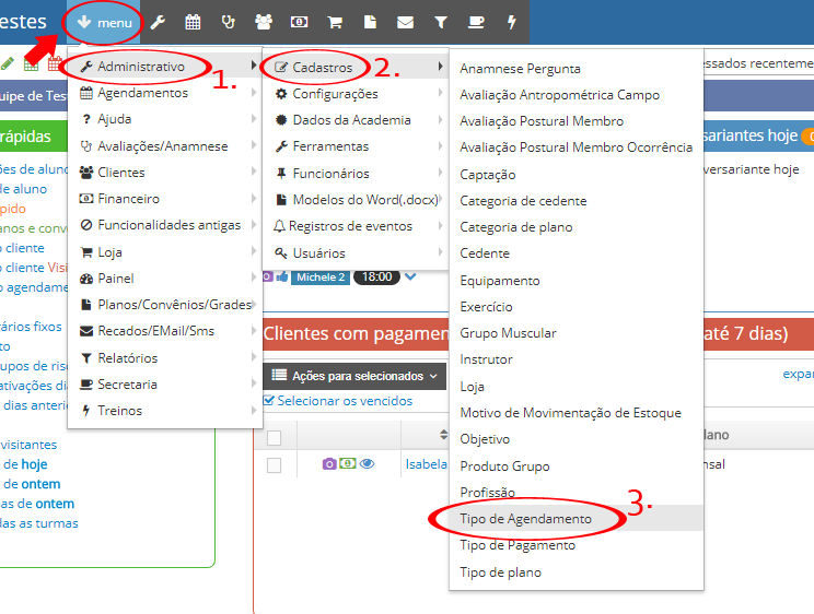 Para poder cadastrar as agendas personalizadas, é necessário que seja cadastrado tipos de agendamento. Por padrão, o sistema vem com tipos cadastrados, para acessar essa listagem vá em MENU -> ADMINISTRATIVO -> CADASTROS -> TIPO DE AGENDAMENTO.