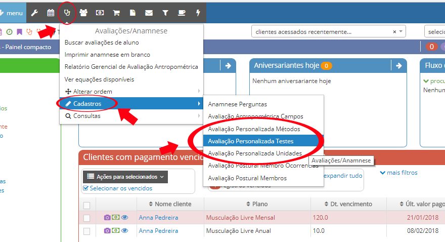 Para cadastrar oc campos para as avaliações personalizadas, vá em AVALIAÇÕES/ANAMNESE -> CADASTROS -> AVALIAÇÃO PERSONALIZADAS TESTES/ MÉTODOS/ UNIDADES.