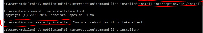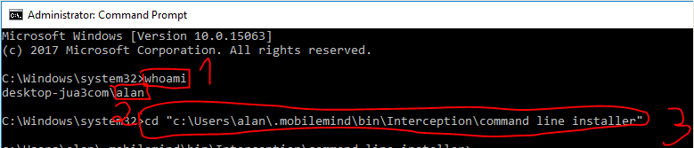- (3) e então digite o comando: cd c:\Users\[nome do usuário obtido]\.mobilemind\bin\Intercept\command line installer, para entrar no diretório de instalação.