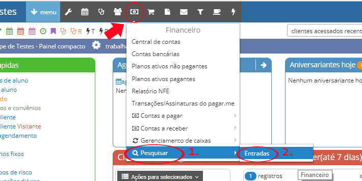 Passo 1 - elecione o ícone FINANCEIRO -> PESQUISAR -> ENTRADAS para puxar uma listagem de itens de pagamento.