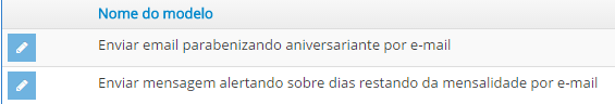 Na listagem exibida, você vai encontrar o modelo com nome 'Enviar mensagem alertando sobre dias restando da mensalidade por e-mail', clique em editar(lápis) para entrar em modo de edição desse modelo, conforme imagem abaixo: