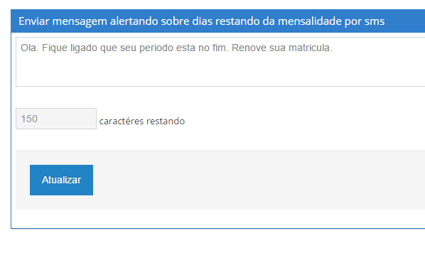 Perceba que há uma contagem de caracteres que limita a mensagem a 150 caracteres, que é o tamanho máximo do sms. Lembrando que, antes de enviar o sms, o sistema irá remover todos os acentos da mensagem.