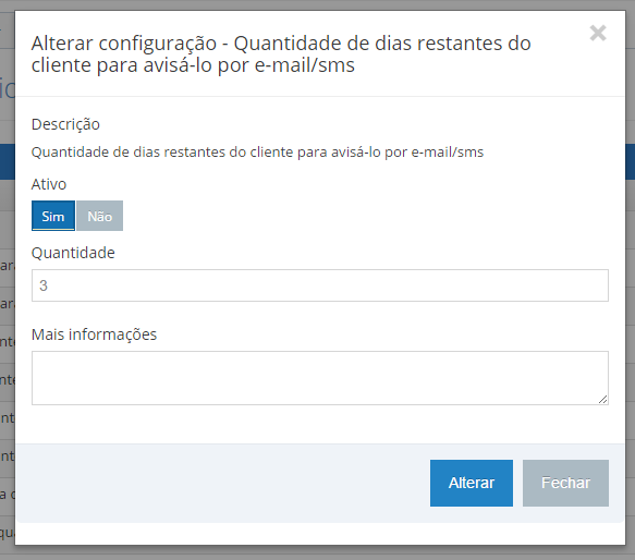 As outras duas configurações devem estar ativas somente para indicar que a mensagem deve ser enviada através do canal(e-mail/sms) especificado, ou seja, seu campo Ativo deve ser marcado com 'Sim'. Se nenhuma delas estiver ativa(nem e-mail, nem sms) então o sistema não irá enviar nenhuma mensagem, o que teria o mesmo comportamento se a primeira configuração, 'Quantidade de dias restantes do cliente para avisá-lo por e-mail/sms' estivesse inativa.