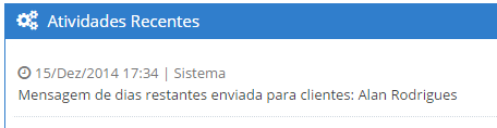 Com as configurações necessárias ativas, o sistema executar essa tarefa diariamente e irá gerar uma mensagem quando despachar as mensagens, que aparecerá no painel do usuário através da seção 'Atividades recentes', conforme imagem abaixo:
