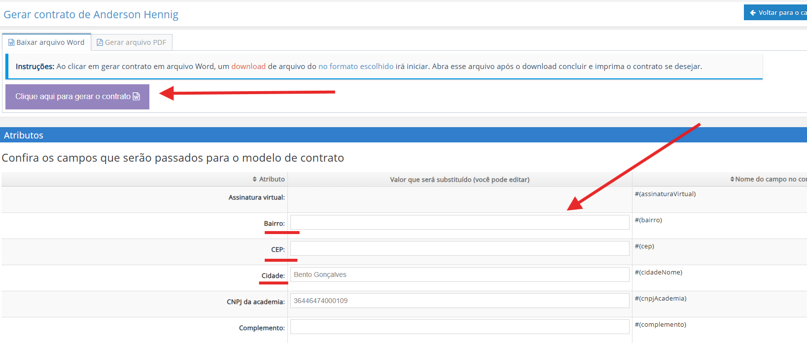 4. Confirme se os campos do contrato estão preenchidos com os dados do aluno e prossiga clicando em "Clique aqui para gerar o contrato". O arquivo do contrato será baixado no seu navegador no formato .docx;
