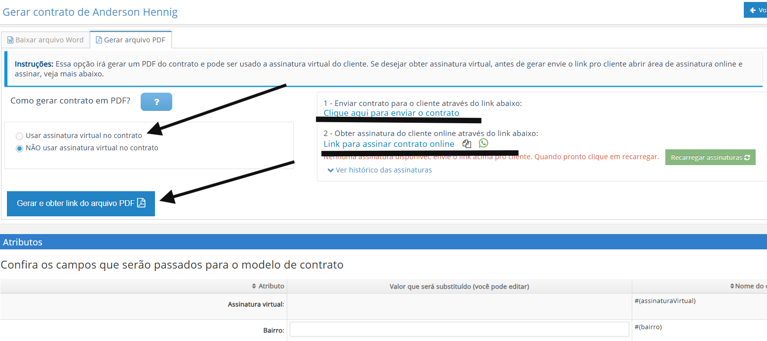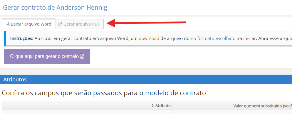 5. Caso deseje gerar o contrato no formato .pdf , clique na aba "Gerar arquivo PDF" que está ao lado de "Baixar arquivo Word";