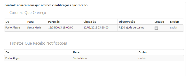 Para controlar(ver, excluir) suas caronas e notificações, é preciso estar na aba "Minhas caronas e notificações" da tela principal do aplicativo onde você pode excluir caronas e marcá-las como lotado, o que acarreta em sua carona não ser mais exibida nos resultados de busca. Suas notificações também podem ser excluídas, cessando o envio de notificações para você.