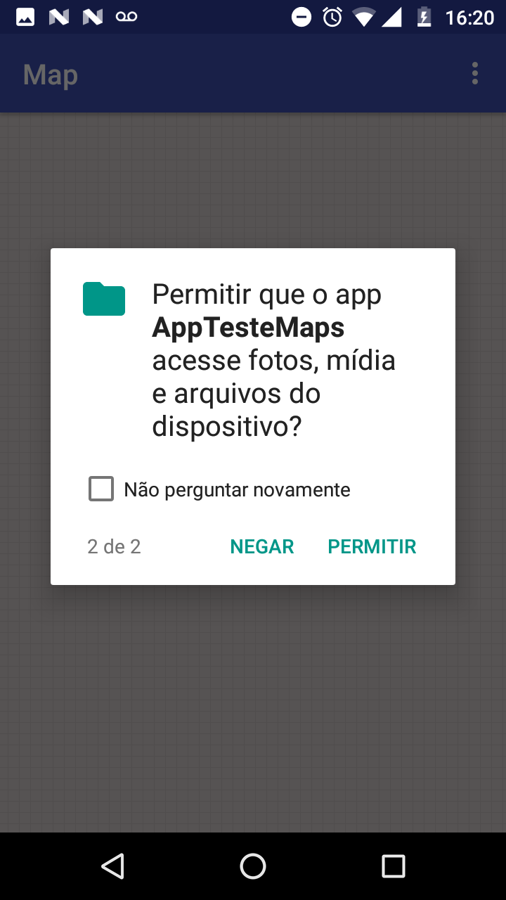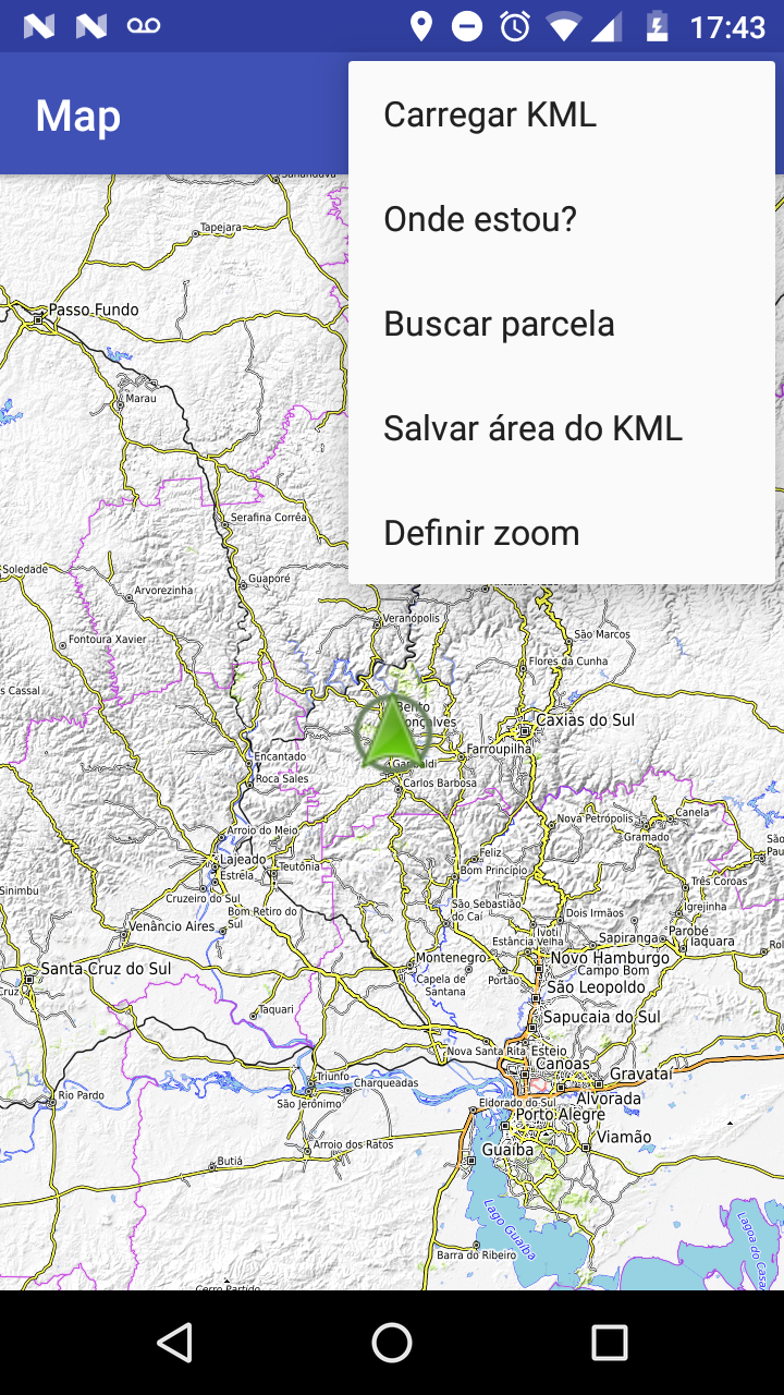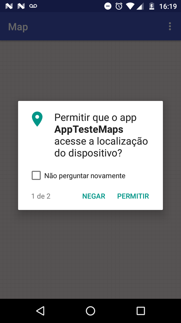 Ao abrir o aplicativo pela primeira vez, você precisará dar a ele permissão para acessar os arquivos do seu dispositivo, para que seja possível carregar o arquivo KML no mapa, e permissão para acessar a sua localização, para seja possível marcá-la no mapa.