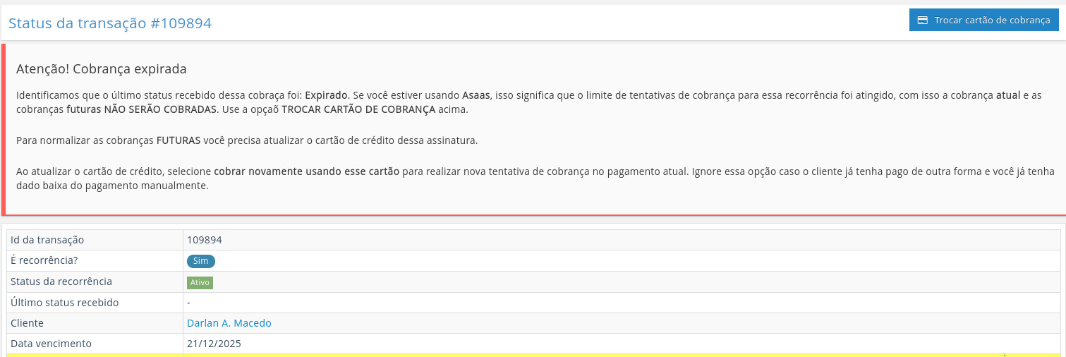 - Se optar por cobrar novamente o sistema vai tentar cobrar e, em caso de sucesso, atualizar o cartão;