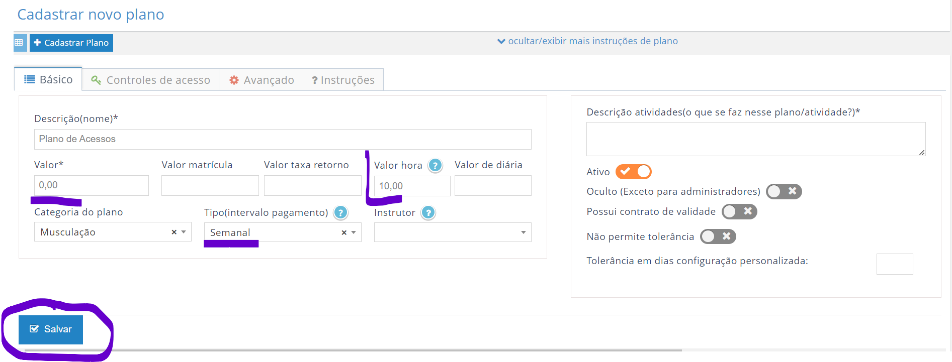 1. Criação do plano: acesse o caminho nos menus Planos/Convênios/Grades > Planos > Criar novo. Para criar um plano que servirá como controlador para desconto dos créditos de um aluno, deverá ser criado deixando o valor zerado, configurando um valor hora (que nesse caso servirá como valor dia) e escolhendo o intervalo de pagamento, neste caso com a função de determinar a validade dos créditos por pagamento;