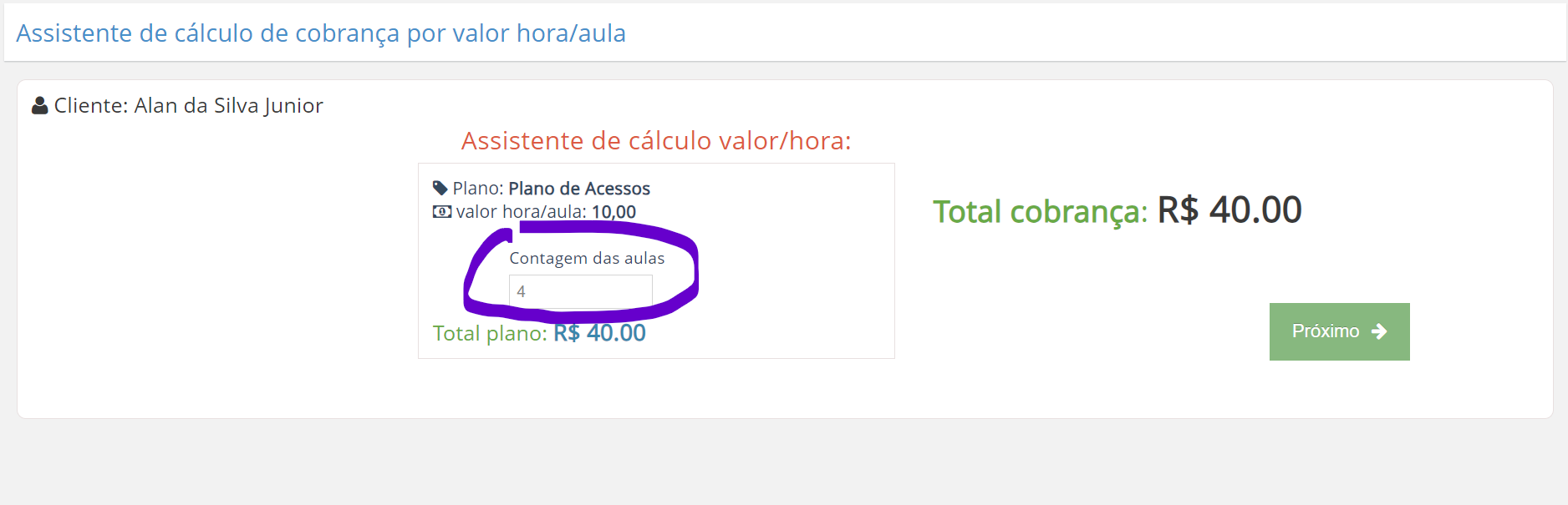 3. Logo após cadastrar o plano para o aluno, vá na opção "Pagamento rápido" e configure a contagem das aulas. Deverá ser configurado conforme o intervalo de pagamento escolhido na hora de criação do plano;