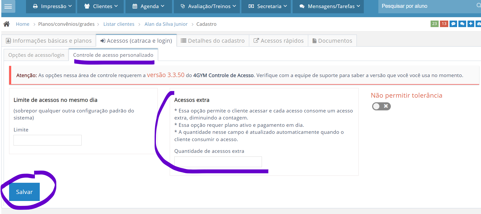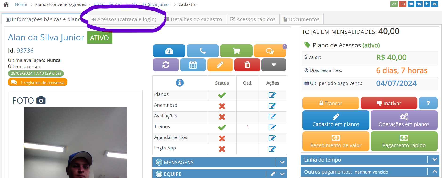 5. Configurando os dias de acesso: na tela do aluno, vá em "Acessos (catraca e login)";