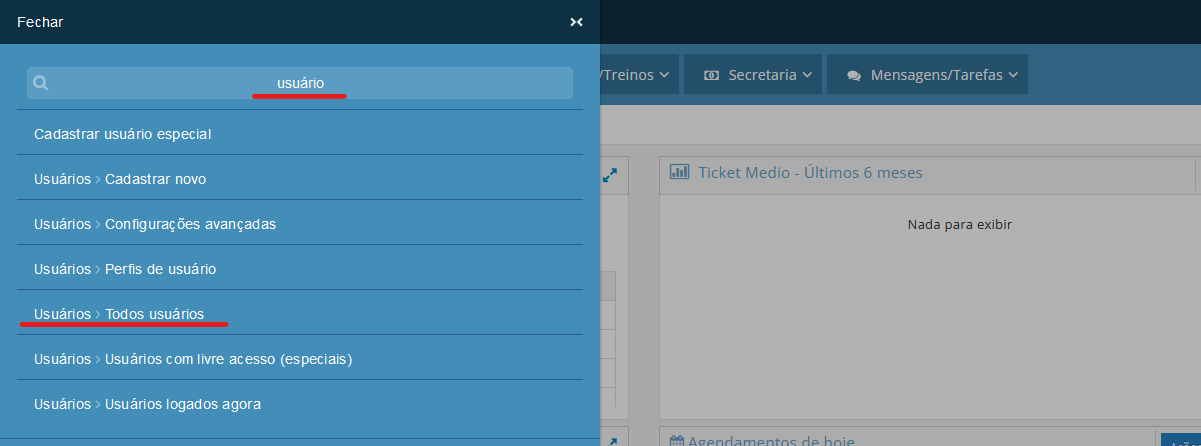 - Clique nas três listras no canto superior esquerdo da tela, na barra de pesquisa digite “usuários” e clique na aba “Todos usuários”;