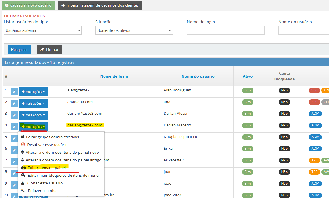 - Na tela que abrir, ache o usuário que deseja realizar as modificações, clique em “mais opções” e depois em “Editar itens do painel”;