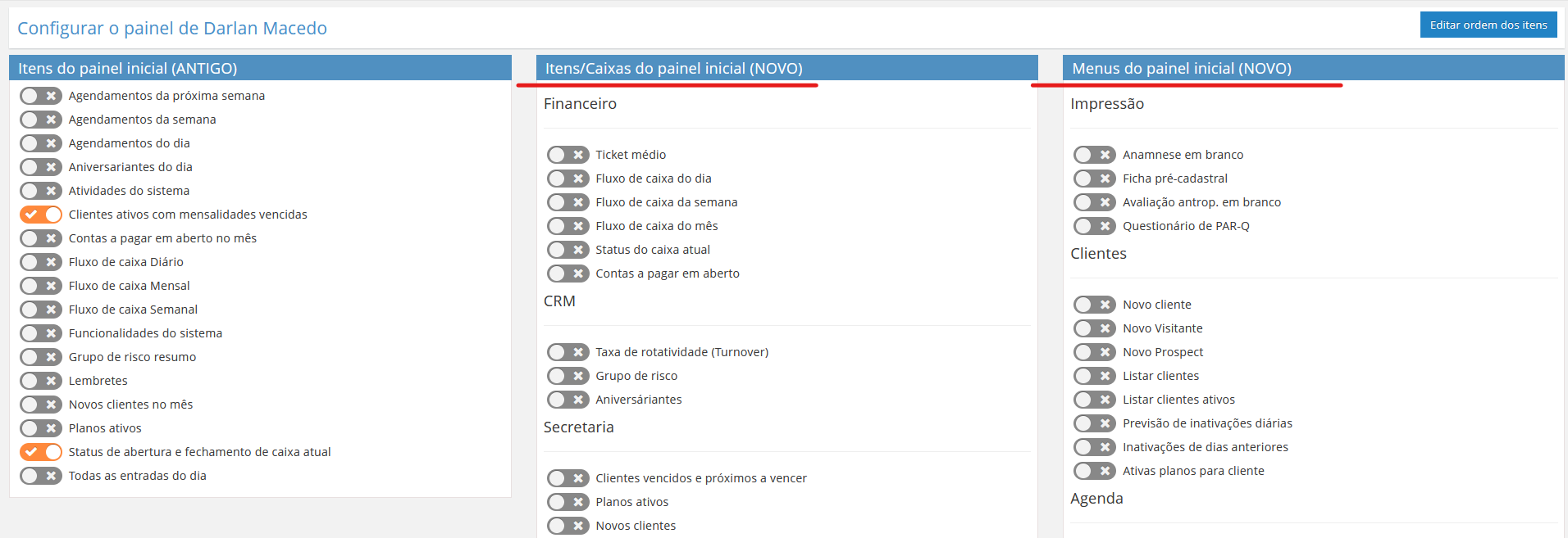 - Na nova tela que abrir repare que existem as colunas “Itens/Caixas do Painel Inicial (NOVO)” e “Menus do painel inicial (NOVO)”, o primeiro, respectivamente, se refere às caixinhas que aparecem no layout inicial e o segundo se refere aos menus em que o usuário terá acesso. Marque as opções que desejar e role a tela até o fim clicando em “Alterar”;
