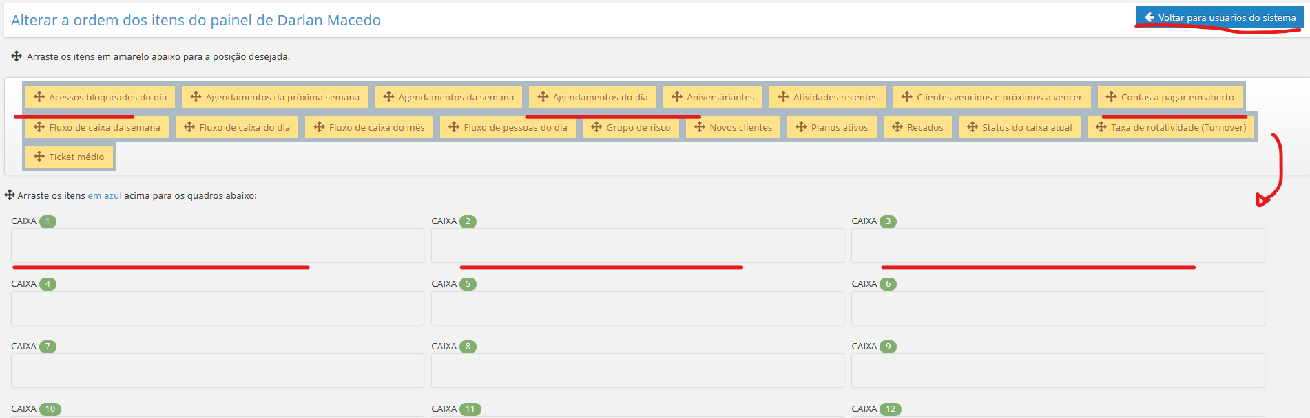 - Na nova tela que abrir, arraste os retângulos em amarelo para a posição que deseja que os itens representem no painel inicial e logo após clique em “salvar alterações”. Feito isso, pode voltar no botão superior direito “Voltar para usuários do sistema”.