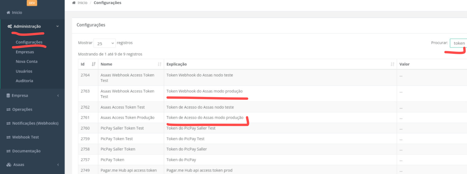 - Acesse Administração > Configurações > busque pela palavra "token";