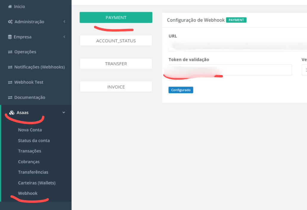 - Siga por "Asaas" > Webhook > Insira o token CRIADO no campo "Token de validação" e depois clique em "Atualizar".