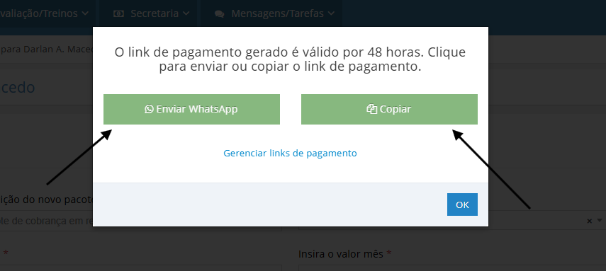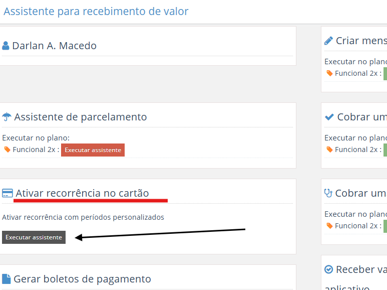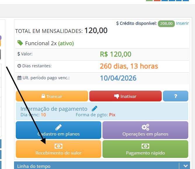 - Entre na tela do aluno na qual deseja ativar na recorrência e enviar o link do pagamento > Clique em "Recebimento de valor";