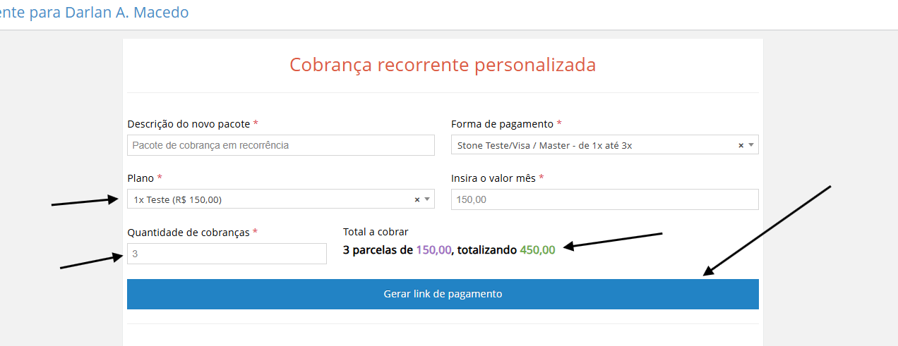 - Preencha as informações necessárias e depois clique em "Gerar link de pagamento" conforme imagem abaixo;