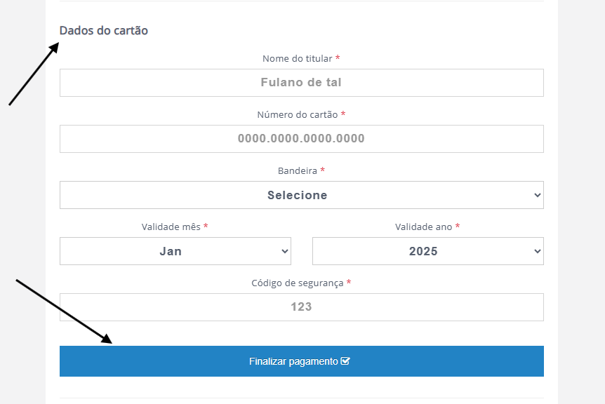 - A imagem abaixo mostra como ficará para o aluno preencher as informações do cartão e finalizar o pagamento no botão indicado;