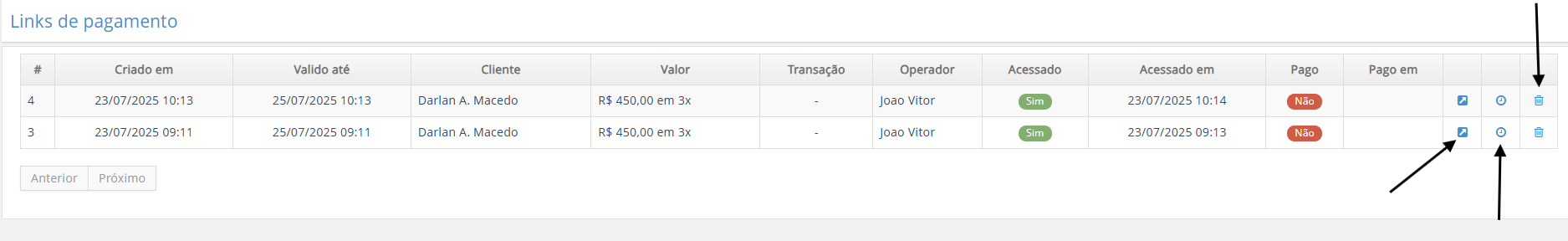- Os ícones laterais possibilitam respectivamente: abrir o link gerado, prorrogar o prazo de validade do link para pagamento e excluir o link gerado. Da mesma forma, será possível verificar se já foi pago conforme o status das colunas "Pago" e "Pago em" que exibirá a respectiva data do pagamento. Veja a imagem abaixo.